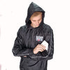 Pockets in pants and jacket. Elastic waist. Long loose arms and draw string hood.